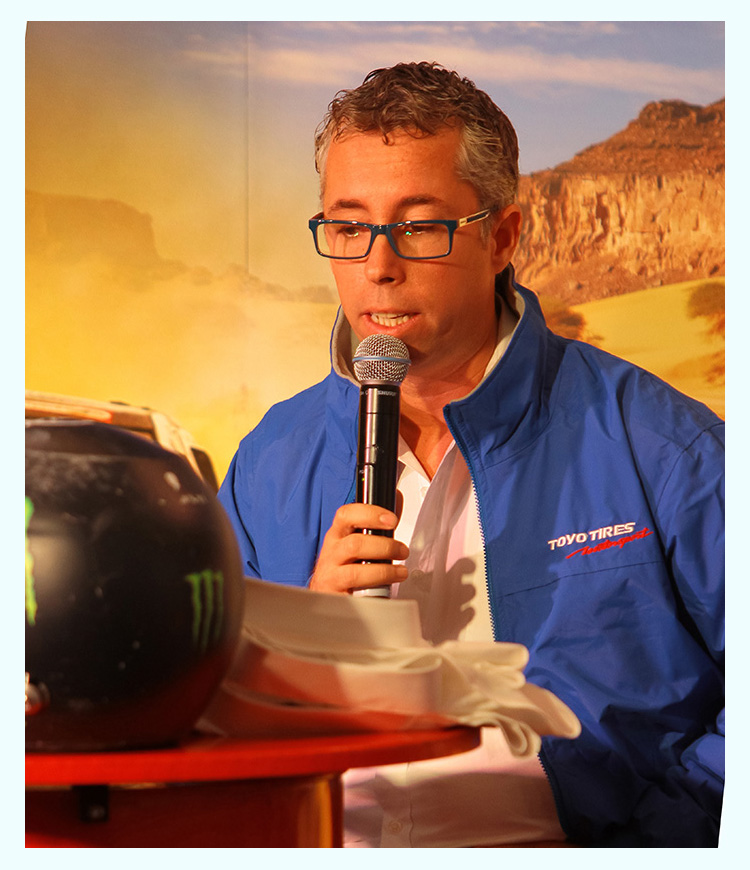 During the press conference, team principal Szalay explained some of the reasons for joining the Africa Eco race after competing in the Dakar 12 times. He also explained how the new shorter car allowed for more manueveability in the dunes and the repositioning of the cooling system to protect it further.