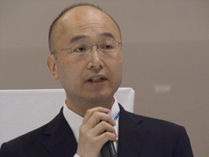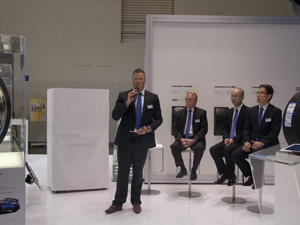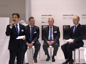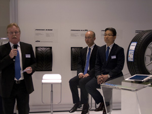 | Mr Sakuramoto, Corporate Officer, Head of European Business Unit, welcomes guests to the press event. | Mr Kanai, General Manager Passenger Car and Light Truck Tire Development, Tire R&D Division introduces NanoEnergy |