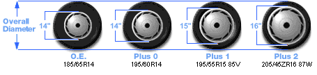 This sizing mounts tires with an increased section width and a lower aspect ratio on wheels of a wider diameter. A Plus One fitment for a car with 13-inch original equipment wheels would use 14-inch wheels.
